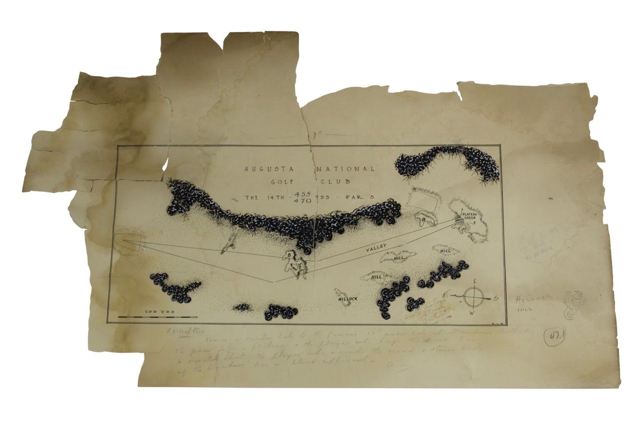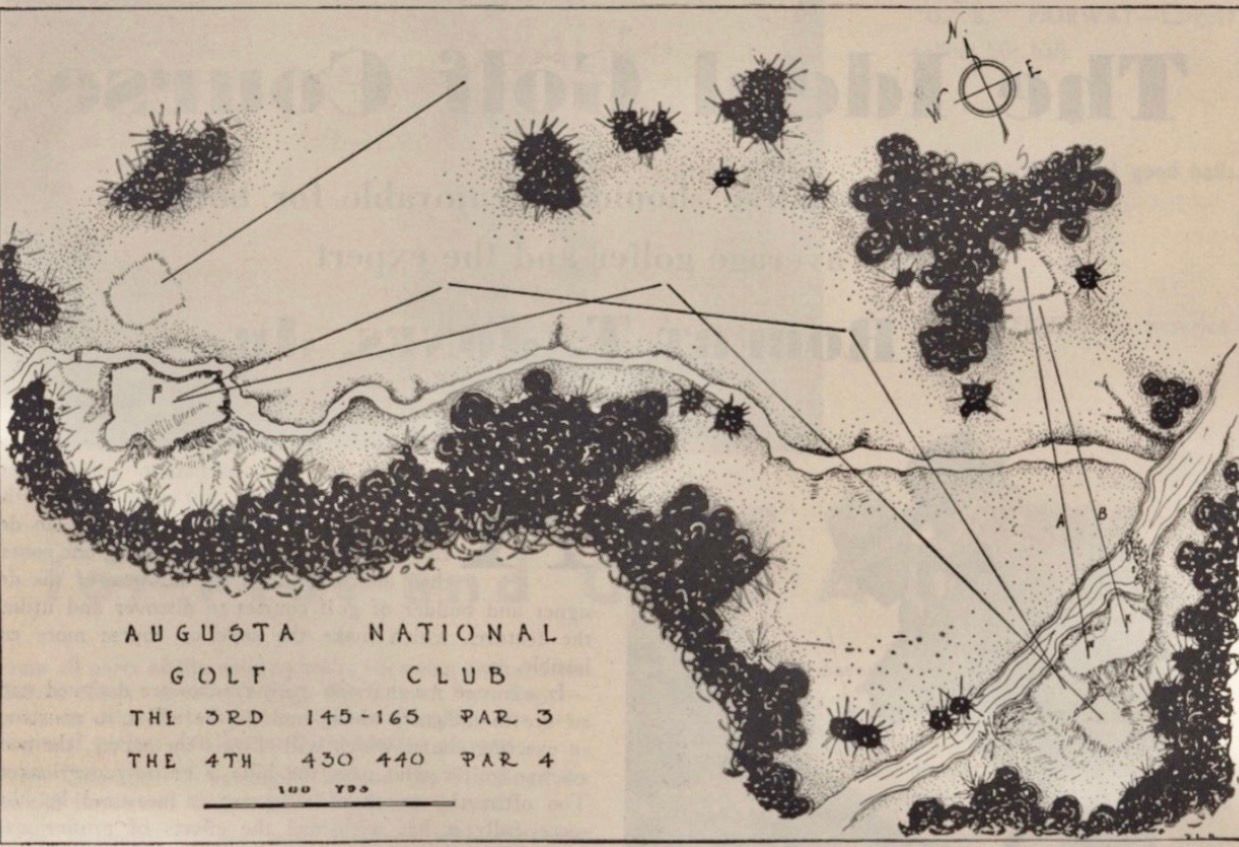 13th Hole: “This is a dog leg hole played diagonally over a stream. The straight and courageous player has a great advantage for his first and second shots. It will be noted there is not a single bunker at either of these holes. There are only twenty-two bunkers on the Augusta National.”
