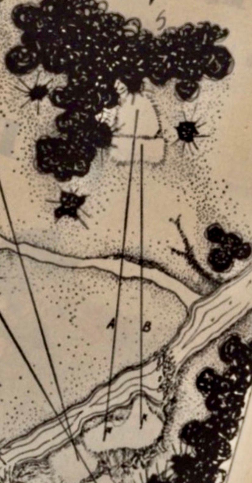 12th Hole: “The tee is on high ground from which the green and stream are very visible. There is a beautiful hill slope beyond the green. "A" is the medal position for the pin. The green is very narrow at this spot and is wide when played along "B" route but this involves a long putt across a “A”. It will be noted that stepping stones lead to the green instead of the usual bridge.”